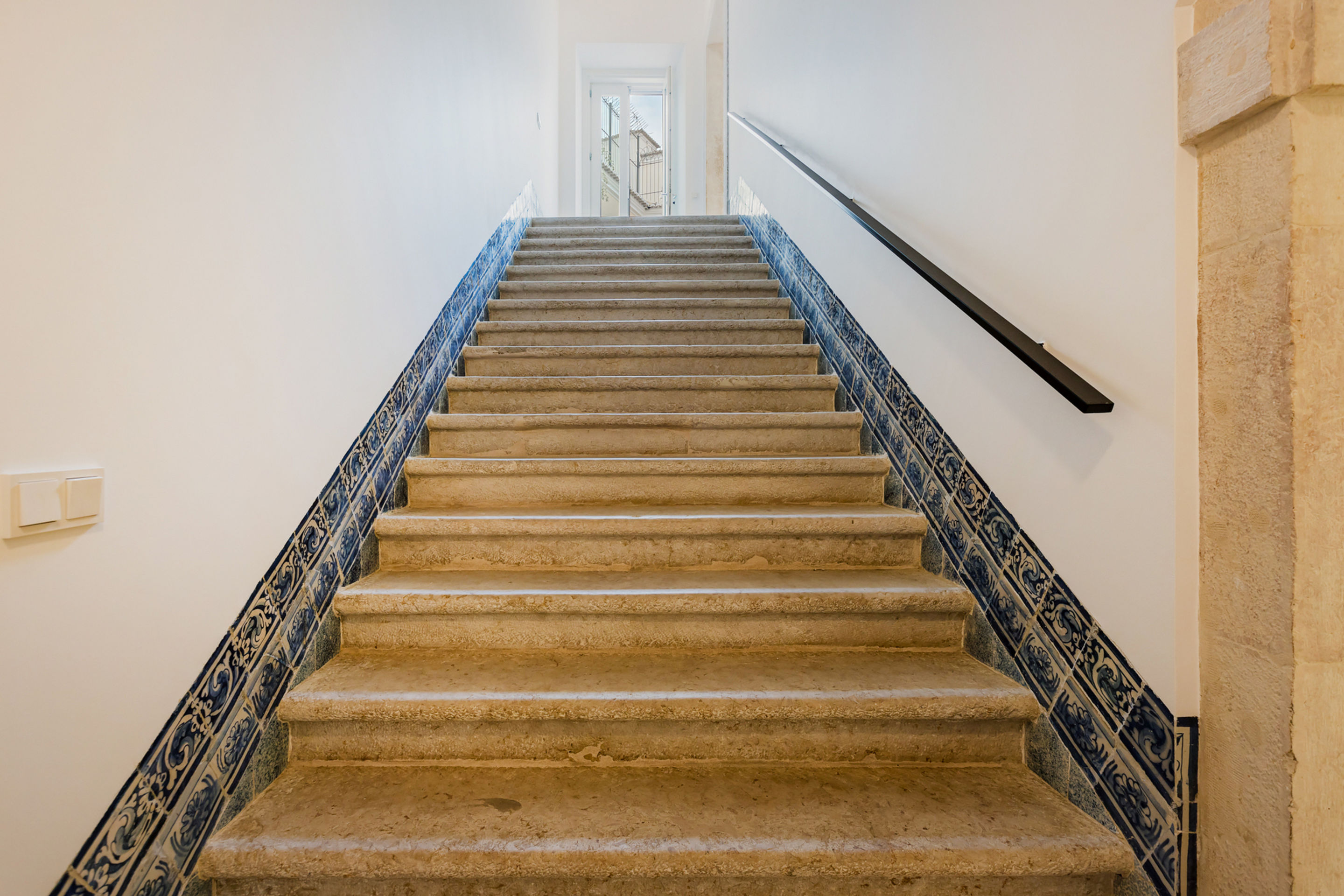 The property features magnificent high ceilings with ornate detailing, giving it a distinct charm and highlighting its rich heritage. It offers a 100 m² terrace, a spacious entrance hall with traditional Portuguese cobblestone flooring, and staircases preserving the original tiles. An elevator serves all floors, and there is private parking for two cars. A video intercom system is also installed on every level.